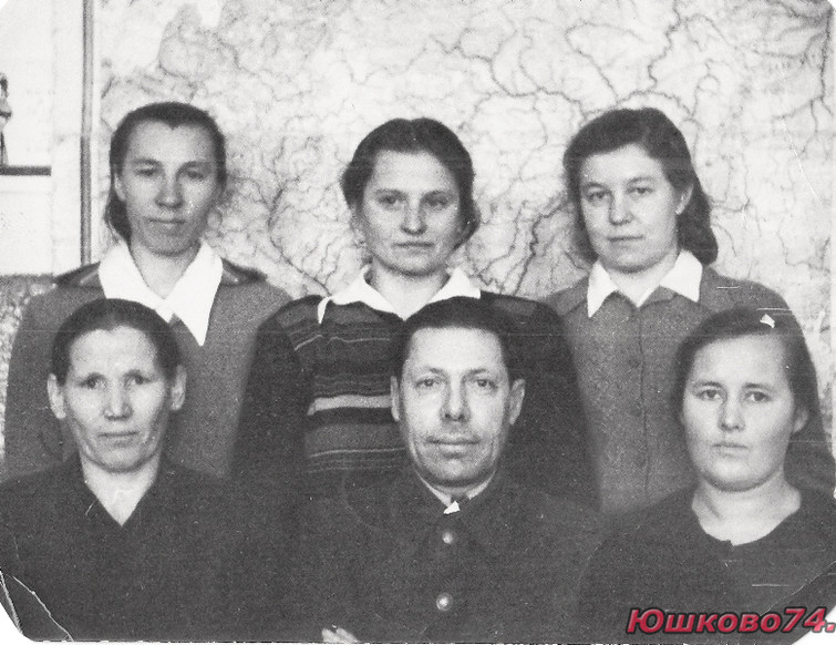 Педагоги Юшковской школы. В центре директор Бердников. Во втором ряду справа Шукшина Антонина Георгиевна и Уфимцева Валентина Александровна.